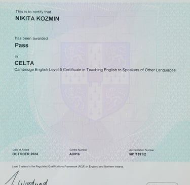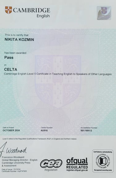 Five years of full-time academic study equipped me with deep expertise in how adults learn languages and how English works at a structural, practical and communicative level.
